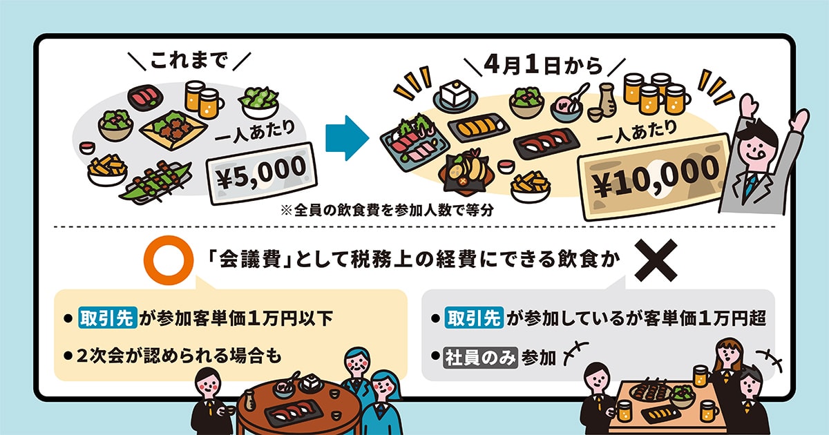 資本金1億円以下の法人はこの特例が使えるので、交際費が年間800万円にもならないような会社であれば、上記の5,000円から10,000円への改正の影響はあまりない、ともいえます。